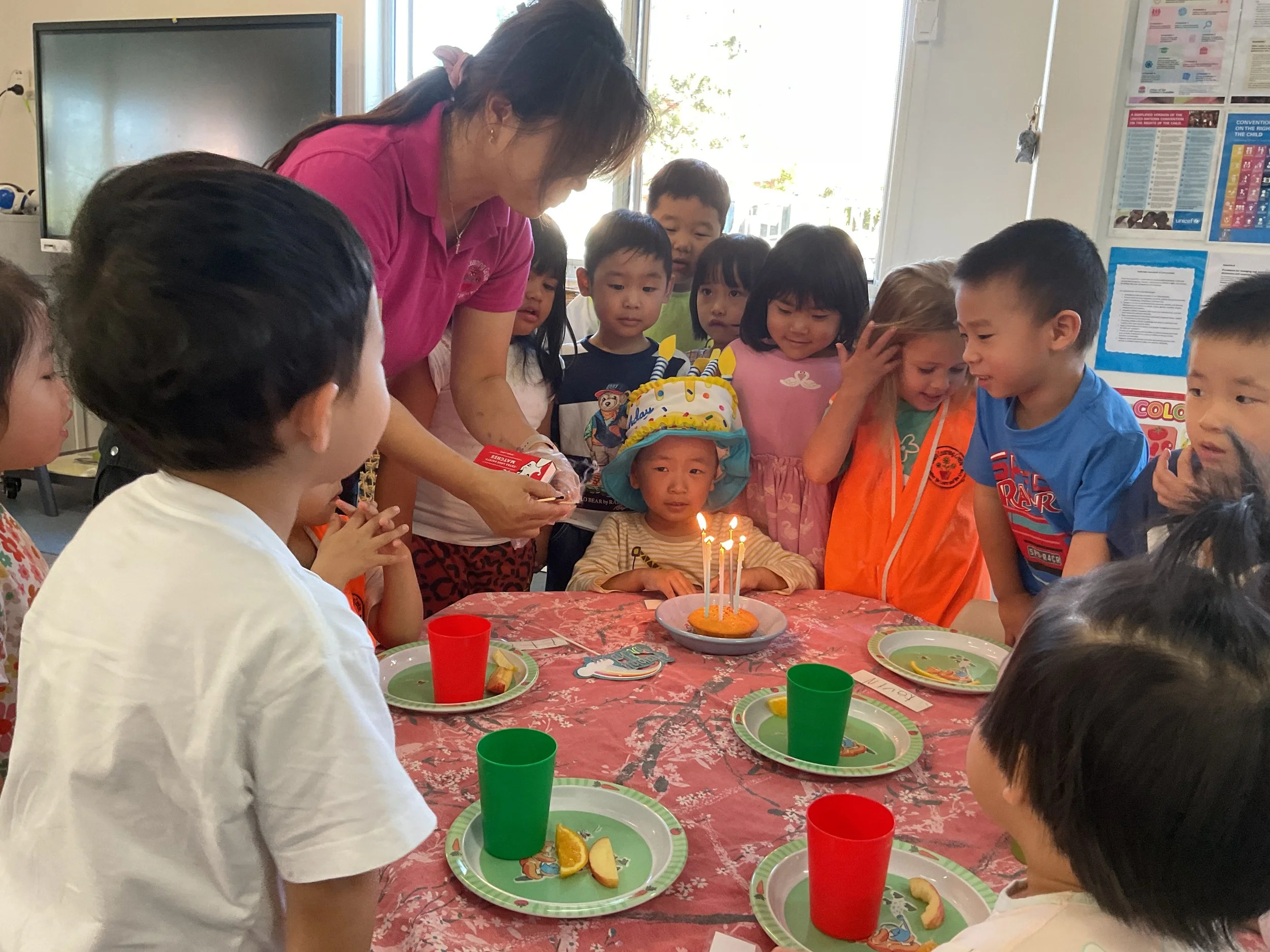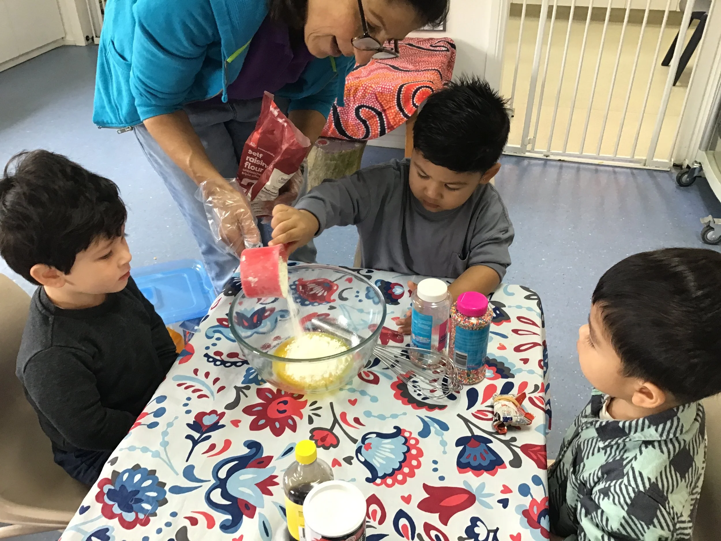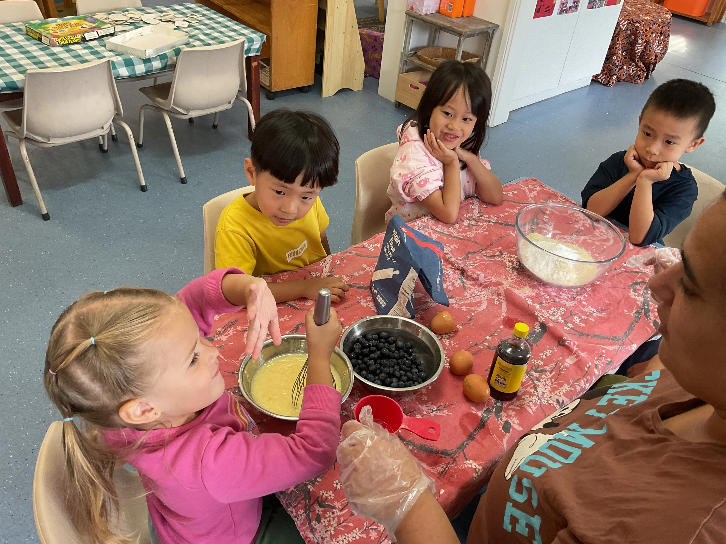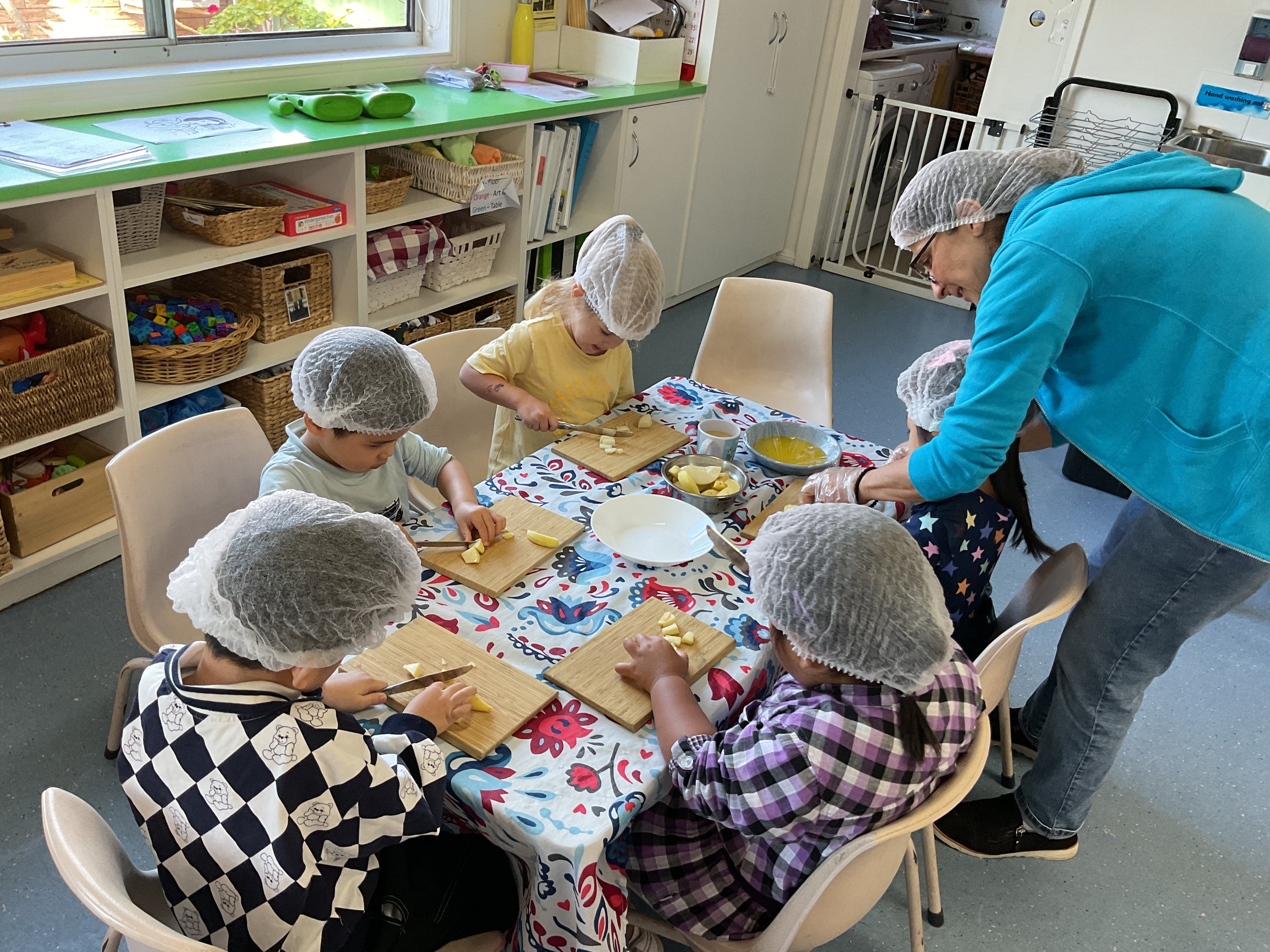 Children actively participate in menu planning and enjoy hands-on cooking experiences, including preparing daily meals and baking birthday cakes, fostering independence, responsibility, and healthy eating habits.