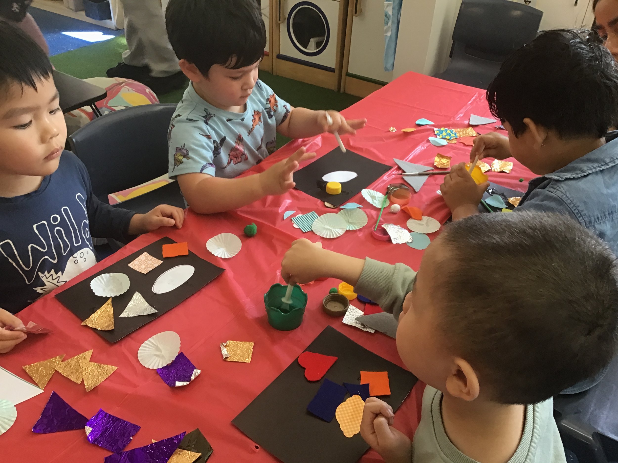 Children explore various forms of visual arts using diverse materials.